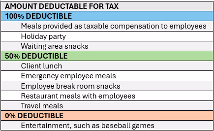 Taxpayers need to play close attention with laws always changing as to what and when they can deduct meals and entertainment, as there are many stipulations that go into qualifying for these deductions. Currently businesses can only deduct 50% of meals purchased from a restaurant.